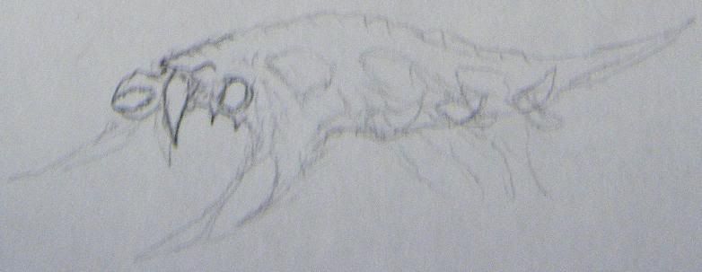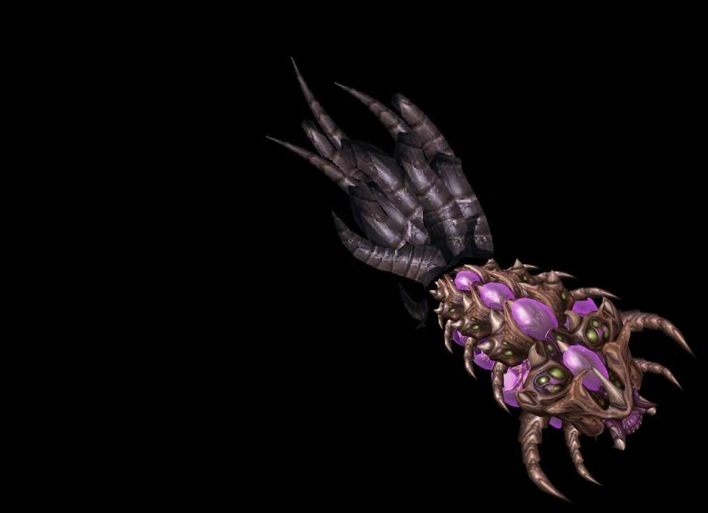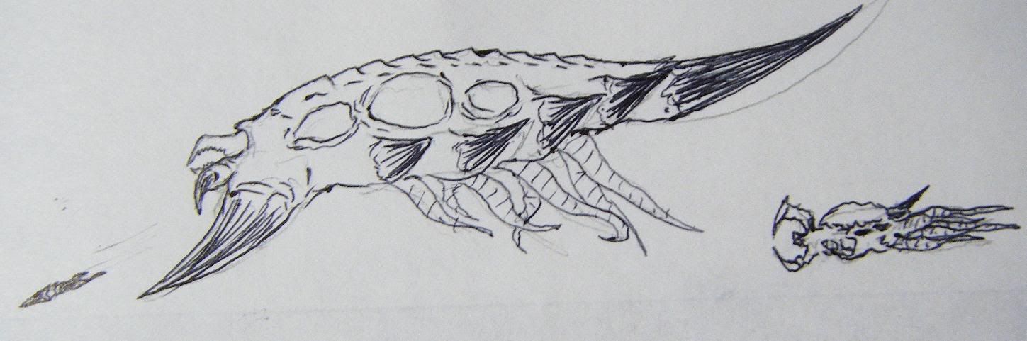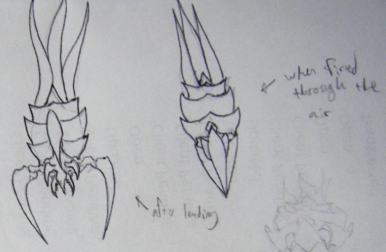Once they hit the target, they open up their claws, exposing their mouths, and upper two mandible-claws. The bottom two claws are used to help them crawl along with the 3 tentacles, that worm them forward, giving them a slightly similar appearance to the original Broodlings. The top claw is primarily for attacking, but as an alternate animation, they could stand with their tentacles, and use all 3 front claws to rip at their targets.
