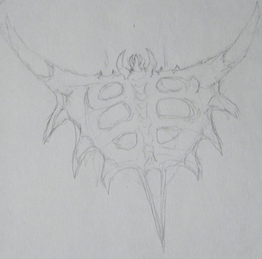 For the BroodLord's anatomy, the top claw was pulled back and fused with the back spike, giving the creature a spine, thus dividing the membrane and splitting the brood to either side of the body. This caused the attack mechanism to move from the mouth to either side of the face. The two claw-mandibles moved down to guard the mouth from them, and gives it a Guardian-like face. The other two large claws were spread open to give it the backwards triangle/manta ray-like look.